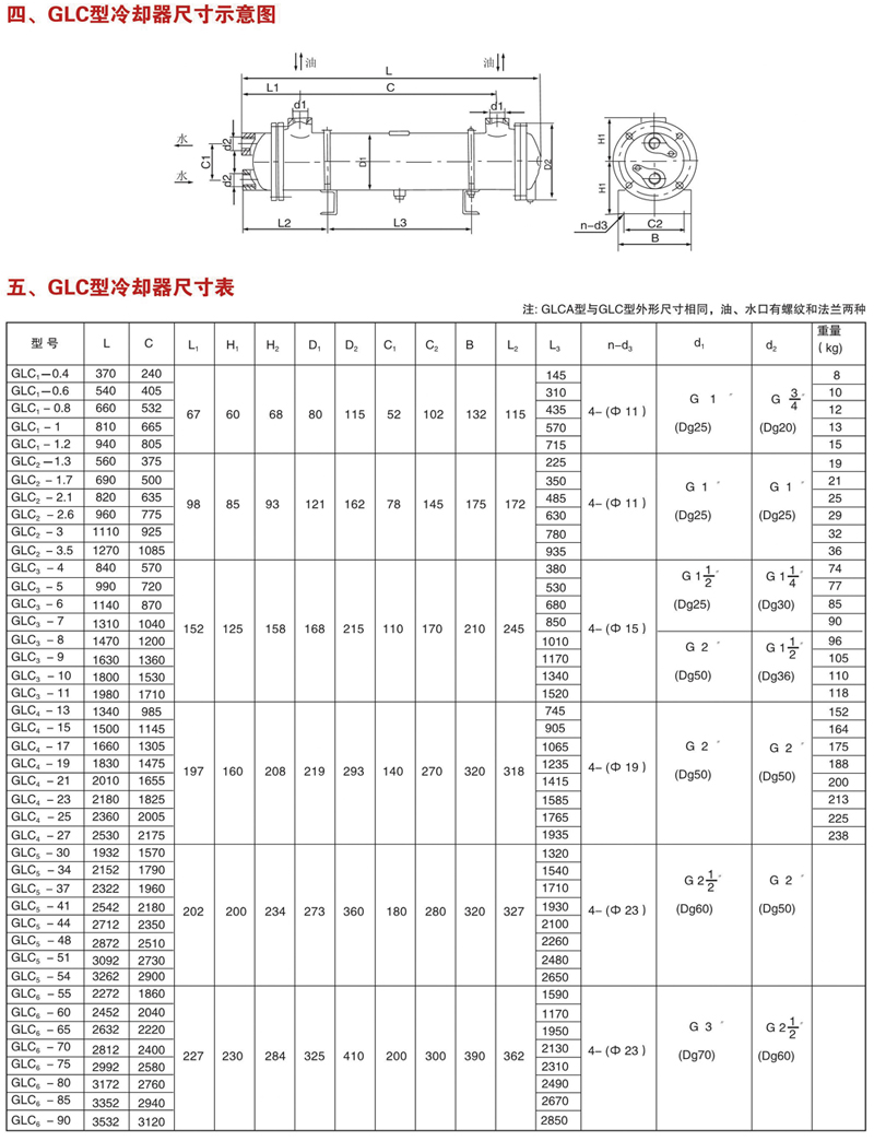 注:GLCA型與GLC型外形尺寸相同,油、水口有螺紋和法蘭兩種冷卻器 |